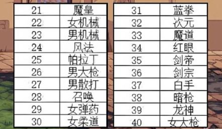 魔皇、女机械、男机械、风法、帕拉丁、男大枪、武极、召唤、女弹药、女柔道、蓝拳、次元、魔道、红眼、剑帝、剑宗、剑魂、暗枪、龙神、女大枪、冰结师、光枪和魔灵