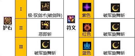 剑宗护石巨剑选择极·驭剑术(破剑阵)、恶即斩、极·驭剑术(幻剑阵)/破军旋舞斩,符文选择九保极·驭剑术(破剑阵)或恶即斩,短宗护石选择极·驭剑术(破剑阵)、极·驭剑术(幻剑阵)、恶即斩/飓风魔剑,符文紫红极·驭剑术(破剑阵),蓝色穿云破空剑。