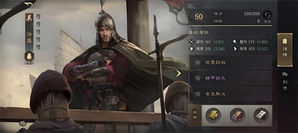 徐盛选择重盾兵,兵种专精选择“屹然不动”:自身每次受到伤害后,有50%概率恢复兵力(治疗率40%,受统率影响),每回合最多2次。