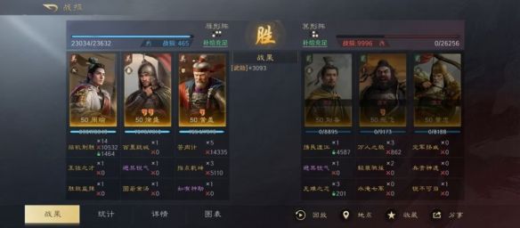 该阵容利用徐盛的高统率和【固若金汤】的百分比统率加成,使得徐盛触发抵御的概率非常可观,从而保证了整个队伍的抗伤能力;黄盖利用【苦肉计】和【指点乾坤】在促进周瑜输出的同时也能更快的叠满【胜敌益强】。