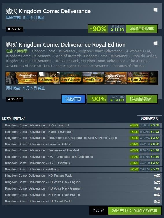 不仅如此,Steam平台还为玩家们准备了丰富的DLC扩展内容,其中包括5个完全免费的DLC,为玩家的游戏体验增添了更多乐趣与选择。值得注意的是,皇家版虽然价格更为亲民,但相较于标准版缺少了3个DLC,这些DLC主要涉及艺术集、音乐等附加内容,对游戏的核心体验并无直接影响,玩家可根据自身需求进行选择。