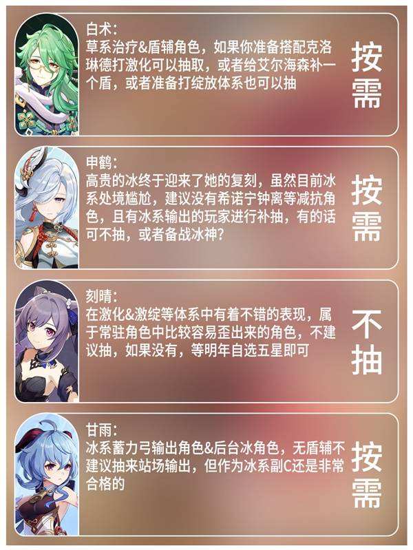 高貴的冰終於迎來了她的複刻,雖然目前冰系處境尷尬,建議沒有希諾寧鍾離等減抗角色,且有冰系輸出的玩家進行補抽