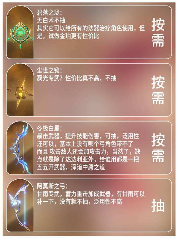 暴擊武器,增加技能的傷害,可抽,泛用性還可以,基本上沒有哪個弓角色帶不了