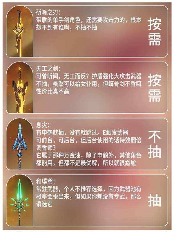 甘雨專武,蓄力重擊加成武器,有甘雨可以補一下,沒有就不抽,泛用性不高