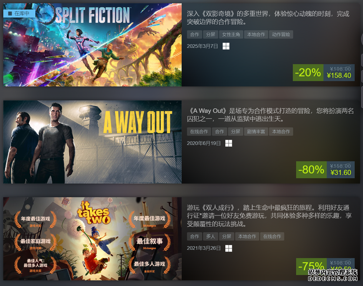 大促期间,另外两款来自 Hazelight 工作室的优秀合作游戏也将参与促销! 即刻购买《逃出生天》立享二折优惠,你将扮演一名囚犯,与另一名囚犯一起逃出监狱。一开始紧张刺激的越狱计划,却转瞬间发生出人意料的转折,带来一段前所未见、情感交织而难以捉摸的冒险。 即刻购买《双人成行》立享二五折优惠,踏上专为二人合作游玩打造的疯狂之旅。你们将扮演科迪和小梅携手闯关,在每个新关卡中掌握独特且彼此关联的角色技能。