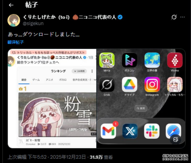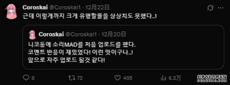事情的高潮出现在12月21日,一位韩国UP主在niconico和YouTube更新了《スピキ - 粉雪》。这条神作瞬间成为N站镇站之宝,很快冲上全站综合第一。作者在推特称自己只是新人UP主,这是她的第一条斯皮奇meme视频,自己也没想到会如此受欢迎。果然新人都是怪物的定律不仅在B站鬼畜区,放到N站同样适用。12月22日斯皮奇登上YouTube热推榜首,同期又占领日本二次元精神故乡niconico全站综合第一,在YouTube和N站总会看到有人在评论区问【jo哇哟是什么意思】。