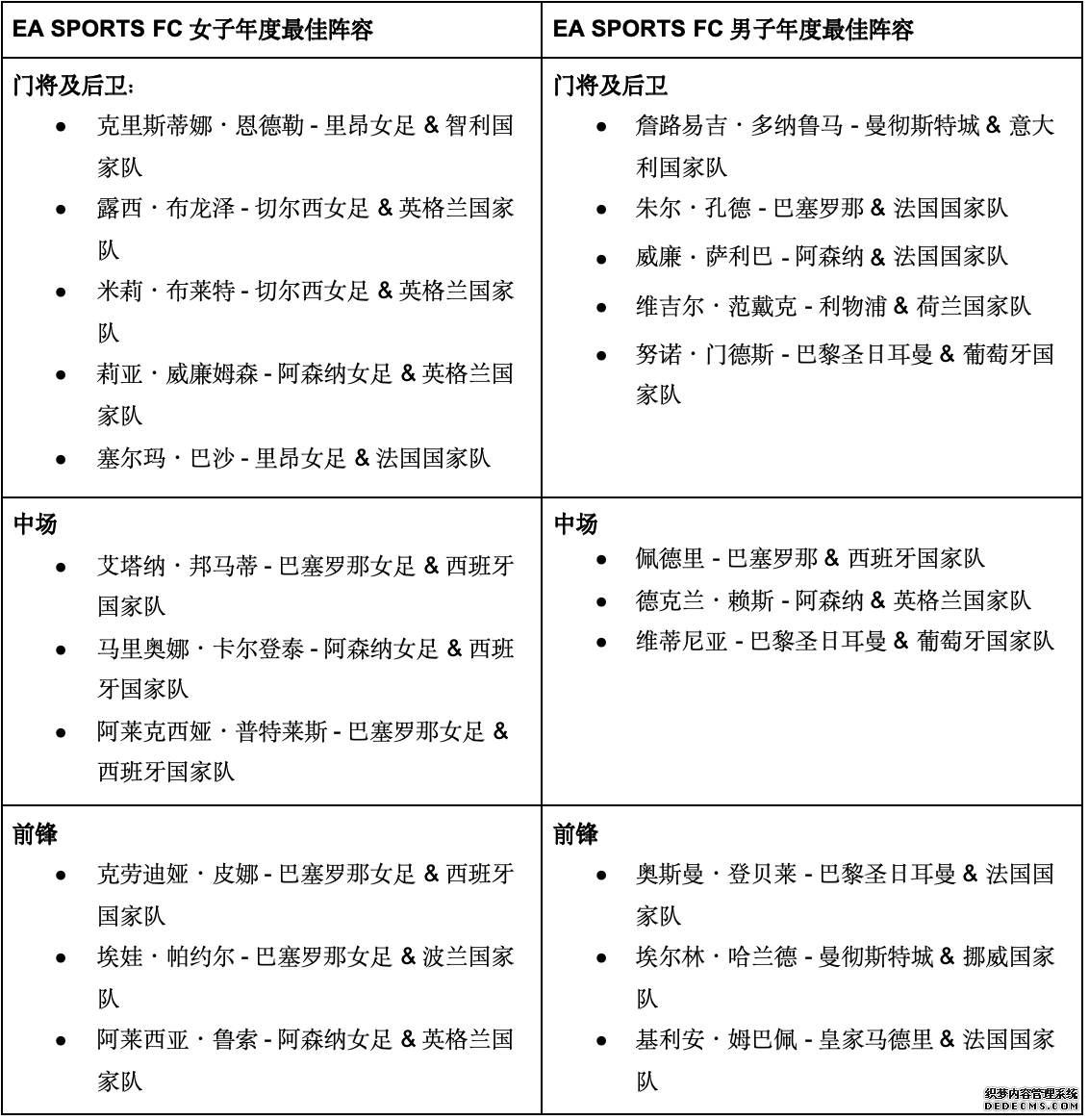 加利福尼亚州红木城– 2026 年 1 月 16 日 —— 美国艺电公司(纳斯达克代码:EA)今日正式公布 EA SPORTS FC 男子及女子年度最佳阵容(TOTY),并首次推出男子及女子 TOTY 队长奖项 —— 以此表彰在 2025 年凭借卓越表现与领导力定义足坛的顶尖球员。